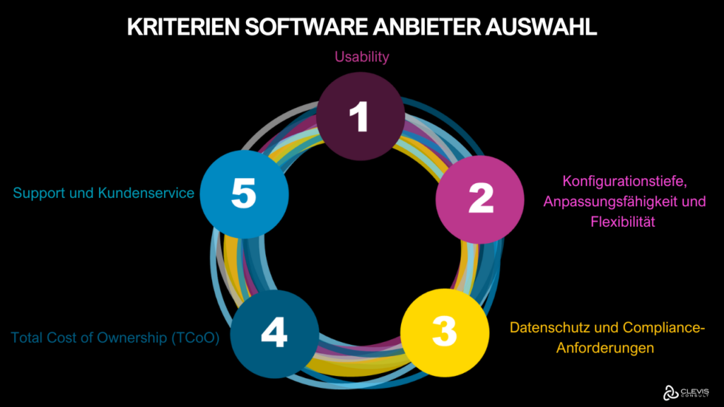 Wesentliche Kriterien umfassen Usability, Anpassungsfähigkeit, Konfigurationstiefe, Datenschutz und Compliance-Anforderungen, Total Cost of Ownership und Qualität des Kundensupports.