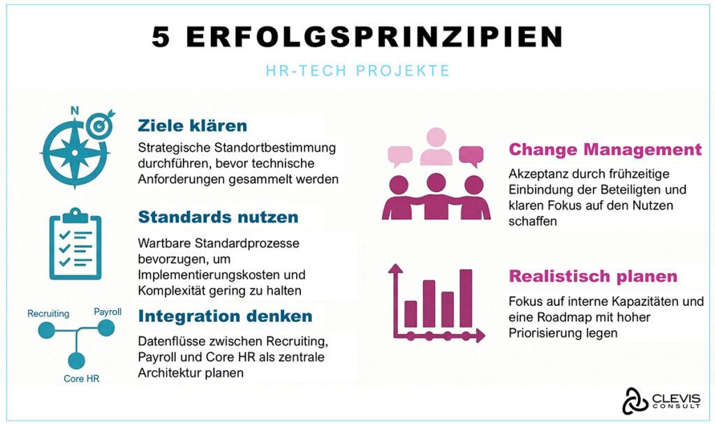 Die Einführung von HR Tech ist heute weniger eine rein technische Aufgabe als vielmehr ein Organisationsprojekt. Systeme lassen sich kaufen – echter Erfolg entsteht jedoch erst durch Klarheit, Prioritäten und ein strukturiertes Vorgehen. Aus unserer Erfahrung haben sich fünf Erfolgsprinzipien herauskristallisiert, die unabhängig von Unternehmensgröße, Branche oder bestehender Systemlandschaft gelten.