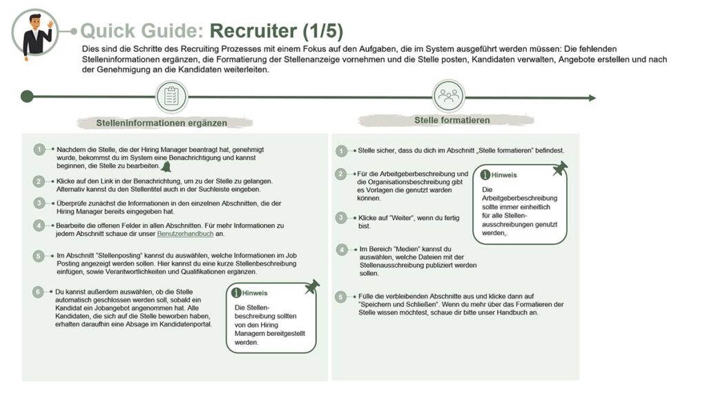 Die im Change Management entwickelten Materialien – wie Prozessbeschreibungen sowie Erkenntnisse und Fragestellungen aus dem UAT – flossen gezielt in die Trainings- und Enablement-Maßnahmen ein. Da das Projekt nicht nur die Einführung eines neuen Systems, sondern auch eine umfassende Veränderung des Recruitingprozesses umfasste, wurden für die Zielgruppen HR und Führungskräfte interaktive E-Learnings in Rise Articulate entwickelt, die sowohl Prozess- als auch Systemwissen vermittelten. Ergänzend dazu entstand ein umfassendes Handbuch für HR, das detaillierte Inhalte und praxisnahe Tipps bereitstellt sowie kurze Quick Guides und One Pagern mit den wichtigsten Informationen auf einen Blick. Darüber hinaus unterstützten wir bei der Konzeption und Erstellung der Unterlagen für das Train-the-Trainer-Programm.